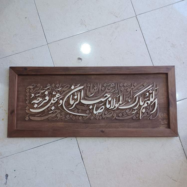 اللهم بارک لمولانا صاحب الزمان_ تکنیک اجرا: کالیگرافی_ دستساز _خاص _ سایز ۳۵×۸۵ _ قابل سفارش با متن دلخواهتون، سوالی داشتین پشتیبانی در اسرع وقت پاسخ داده خواهد شد