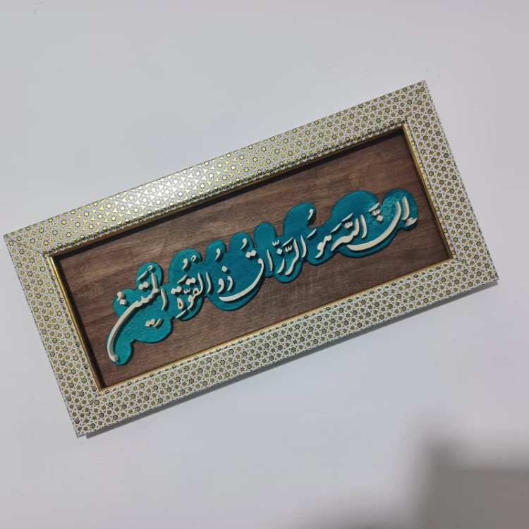 این تابلو کاملا دستساز و بسیار تمیز کار شده سایز 18×38 قاب طرح خاتم بسیار زیبا و با کیفیت ضخامت نوشته ها حدود یکسانتیمتر هست و با چوب روسی کار شده دارای جعبه مخصوص و بسته بندی مناسب جهت ارسال به سراسر کشور ضمنا میتونید با متن دیگه و در ابعاد دیگه هم سفارش بدین از بقیه محصولات غرفه مون هم دیدن کنید😊