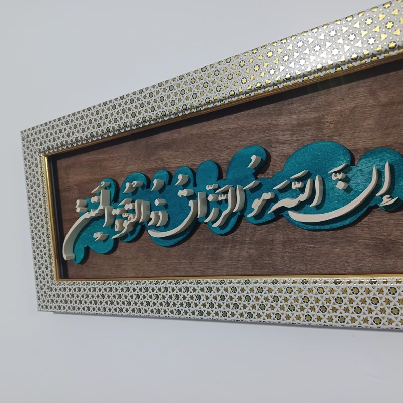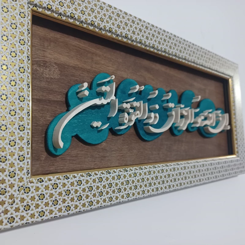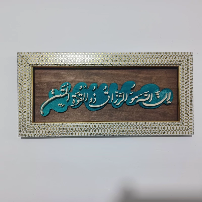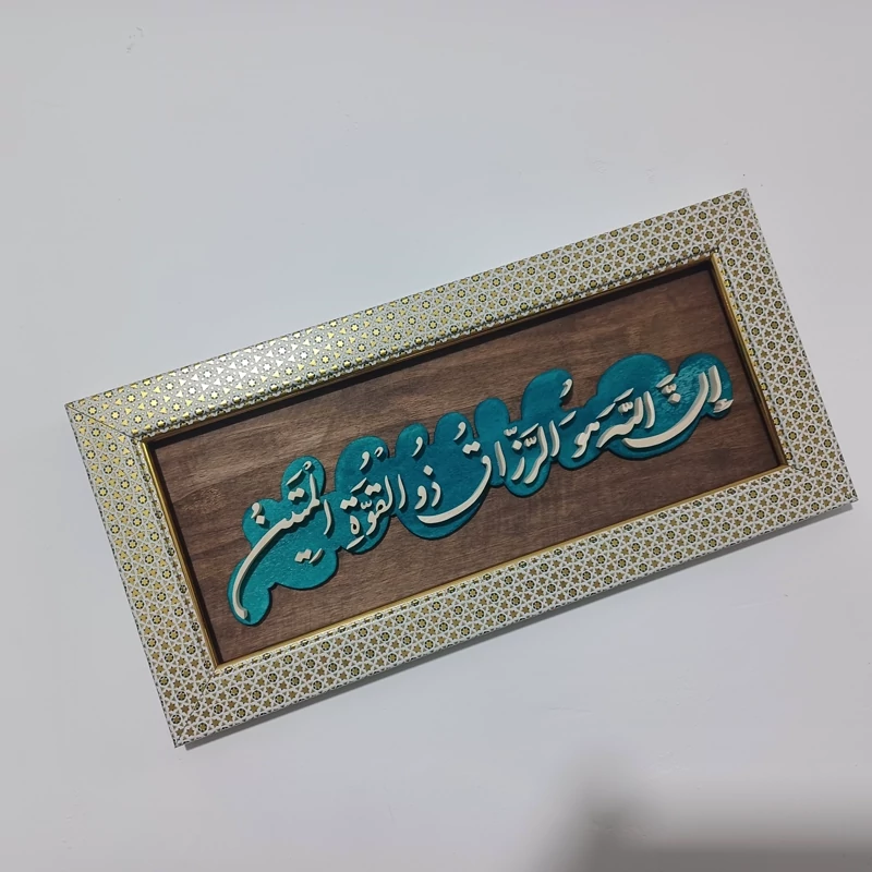 این تابلو کاملا دستساز و بسیار تمیز کار شده سایز 18×38 قاب طرح خاتم بسیار زیبا و با کیفیت ضخامت نوشته ها حدود یکسانتیمتر هست و با چوب روسی کار شده دارای جعبه مخصوص و بسته بندی مناسب جهت ارسال به سراسر کشور ضمنا میتونید با متن دیگه و در ابعاد دیگه هم سفارش بدین از بقیه محصولات غرفه مون هم دیدن کنید😊