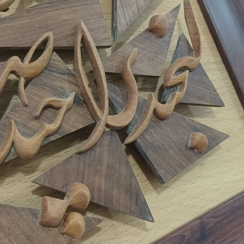 قسمتهایی که نوشته ها روی اونها چسبیده شدن، چوب گردو هست و زمینه زیرین کار چوب راش هست.